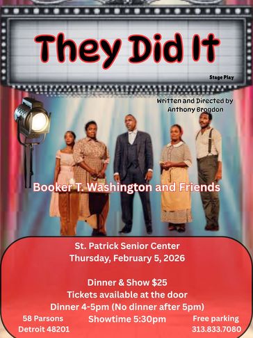 They Did It, stage play written and directed by Anthony Brogdon. It's based on his book Black Business Book. Booker T. Washington and 10 of his rich friends share their stories. 1 hour and 15 minutes run time with soul food dinner from 4-5pm, play starts at 5:30. All proceeds benefit St. Patrick Senior Center. The actors are from the center.